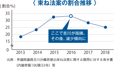 安易な束ね法案は、国会審議を形骸化します。複数の重要法案を束ねて国会に提出された場合、何の法律が改正されるのか分かり辛くなり、情報提供の面からも問題があります。2016年に吉川さおりが指摘した後、その割合は減りました。